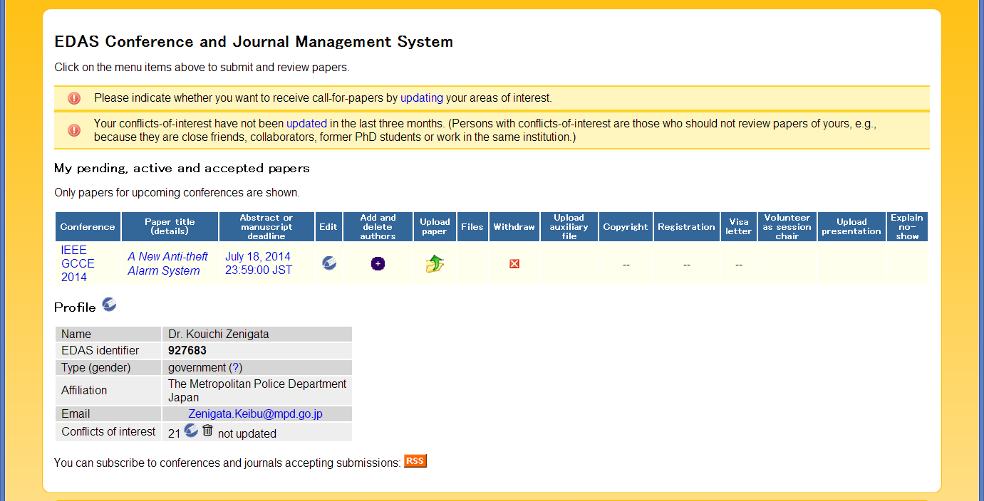 - Registered papers are now listed in your home page. Click icon at "Upload paper" to proceed.