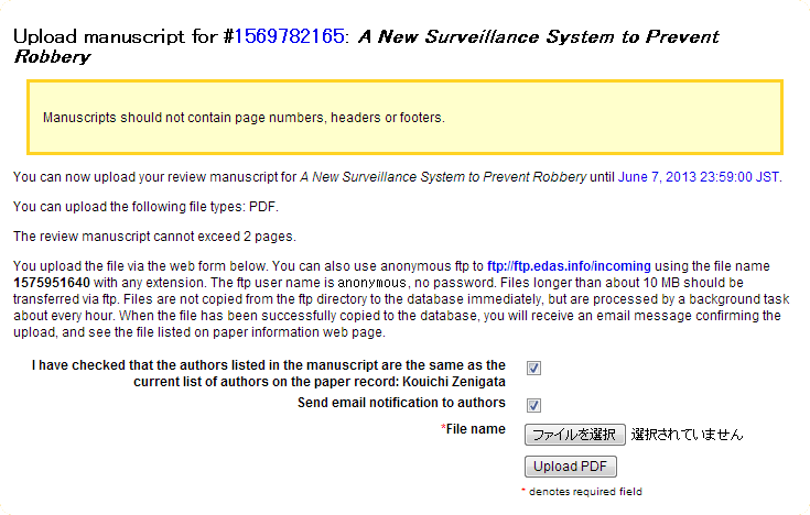- Confirm that authors listed in your manuscript are correctly registered on EDAS. Check the checkbox and proceed uploading.